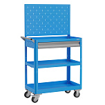 Корпус выполнен из листовой стали толщиной от 0,6 до 1,5 мм., покрыт полимерной порошковой краской. С перфорированной панелью для навесных элементов и выдвижным ящиком на шариковых телескопических направляющих. Общая равномерно-распределённая нагрузка на тележку - до 100 кг. Верхняя и средняя полка имеют высоту борта 40 мм., нижняя полка имеет высоту борта 60 мм. Размер 950х700х450 мм.