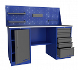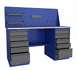 Двухтумбовый. Допустимая нагрузка на столешницу 1000 кг. Опорные элементы выполнены сварными из холоднокатаной стали. Для выполнения сборочных, ремонтных, слесарных, монтажных и других видов работ на производстве, в сервисных центрах, мастерских, гаражах, а также для обучения технологии в учебных заведениях. Комплектуется полкой-стенкой, расположенной под столешницей для удобного размещения габаритного инструмента и оснастки. Размеры верстака: 855x1596x696 мм. Вес: 123 кг. Поставляется в 4 комплектациях на выбор.
