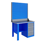Однотумбовый. Допустимая нагрузка на столешницу 750 кг. Опорные элементы выполнены сварными из холоднокатаной стали. Верстак состоит из столешницы, опоры, тумбы P3 с тремя большими ящиками, полки-стенки и одинарного экрана с кронштейнами. Все металлические элементы покрыты полиэфирной порошковой краской. Столешница состоит из фанеры марки ФСФ толщиной 24 мм, которая покрыта лаком-антисептиком и листом оцинкованной холоднокатаной стали толщиной 1,2 мм. Размеры (ВхШхГ) 1470x1196x696 мм.
