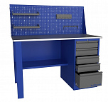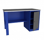 Однотумбовый. Допустимая нагрузка на столешницу 750 кг. Опорные элементы выполнены сварными из холоднокатаной стали. Верстак состоит из столешницы, поры, тумбы P4 с двумя малыми и двумя большими ящиками, полки-стенки и одинарного экрана с кронштейнами. Все металлические элементы покрыты полиэфирной порошковой краской. Столешница состоит из фанеры марки ФСФ толщиной 24 мм, которая покрыта лаком-антисептиком и листом оцинкованной холоднокатаной стали толщиной 1,2 мм. Размеры (ВхШхГ) 1470x1396x696 мм.