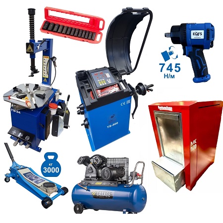 Комплект: шиномонтажный станок TS-21 для дисков: внешний 11÷20” + пистолет с манометром для подкачки шин + монтажка + пластиковые накладки на зажимные кулачки + регулятор давления с влагоотделителем и манометром. + TS-500 балансировочный станок с автозапуском, для колес легковых автомобилей и легких грузовиков, диаметр диска с резиной до 760 мм. размеры диска: ширина 3"–9” (76-228 мм), диаметр диска 10"–21” (254-533 мм). + кожух защитный + клещи + кронциркуль + быстрозажимная гайка + набор конусов + подкатной домкрат г/п 3,0т. 130-465мм. + ударный пневмогайковерт 1/2" крутящий момент 745Нм + шланг кислородный 9мм 20Атм. 10м