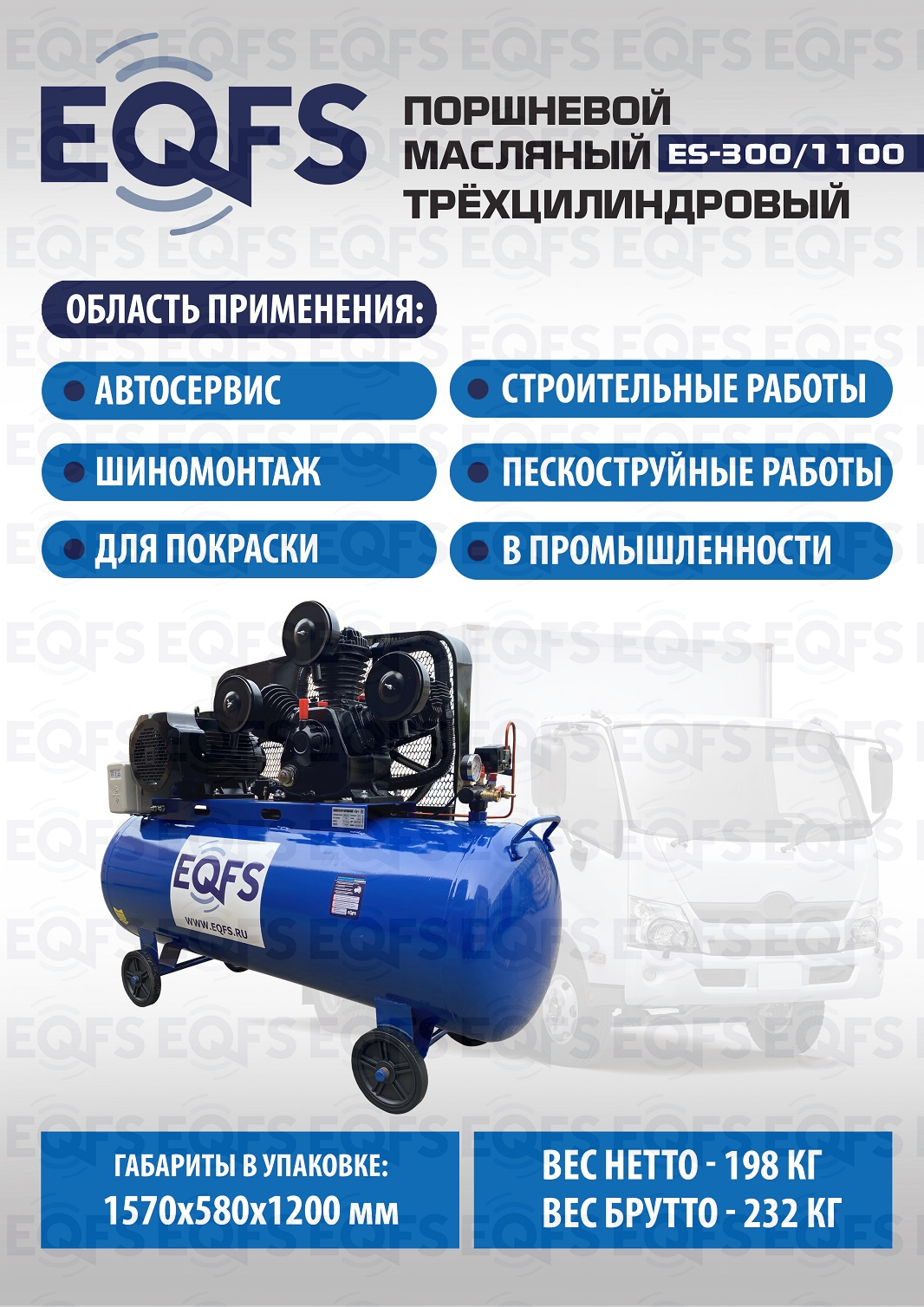 Компрессор воздушный, передвижной, поршневой, масляный, трёхцилиндровый. Быстро достигает нужного давления. Трёхпоршневая головка двигателя уменьшает износ деталей и увеличивает срок службы. Ремённый привод — предохранят мотор от поломки. Идеальное решение для шиномонтажа, автосервиса, строительства, покраски, промышленности. Давление 8 Атм. Производительность 1100 л/мин. Мощность 7,45 кВт. Напряжение 380В. Ёмкость ресивера 300 л. Гарантия 12 месяцев.