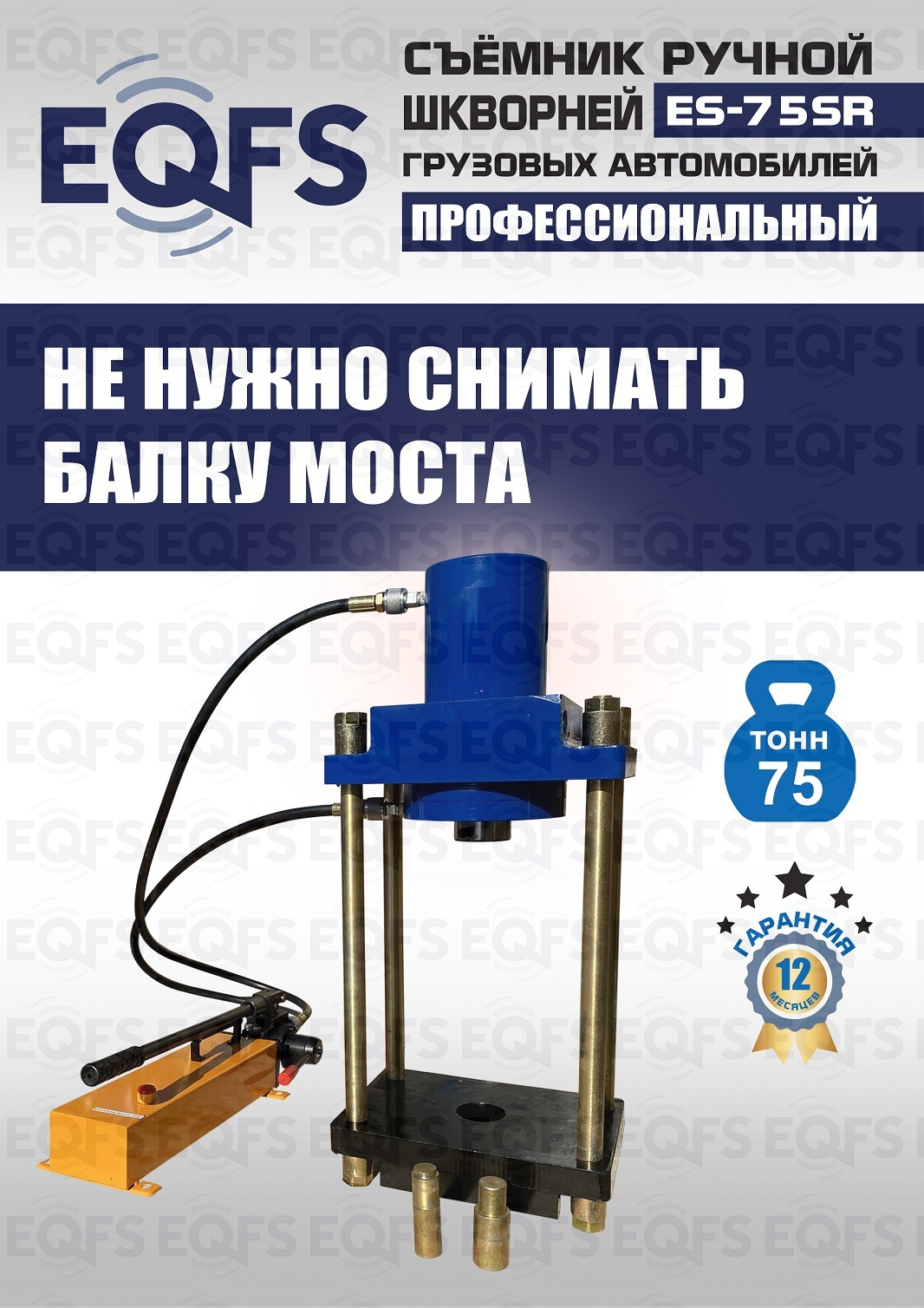 Для выездных работ. Сокращает время ремонта. Позволяет работать под разными углами. Для выпрессовки шкворней из поворотной цапфы погрузчиков, тракторов, строительной техники, коммерческих и грузовых авто отечественного и импортного производства: MAN, MERCEDES, SCANIA, VOLVO, Корейские и Китайские авто. Можно использовать при выездных работах. Ручной гидравлический привод. Рабочее окно 400x320 мм. Усилие 75 тонн.