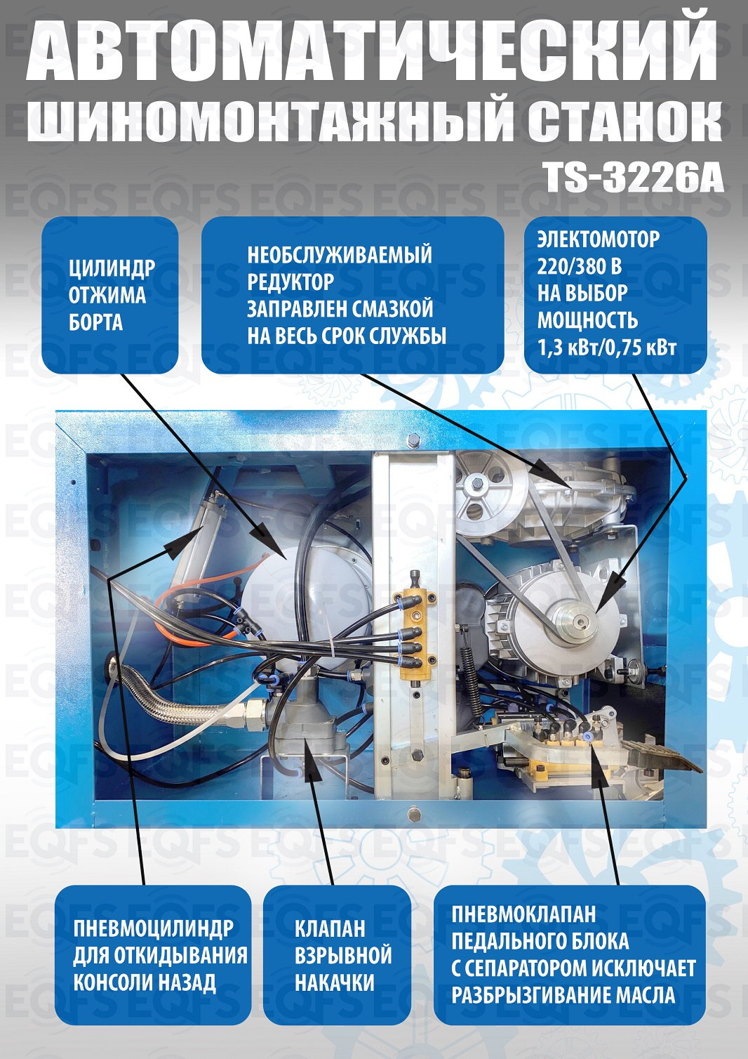Автоматического шиномонтажного станка TS-3226А предназначен для монтажа и демонтажа колес легковых автомобилей, легких грузовиков, не больших автобусов и коммерческой техники. Для дисков: 11÷24”. В комплекте: полноценная 3-я рука для работы с жесткой и низкопрофильной резиной RUNFLAT. + встроенный бустер 24 литра (взрывная подкачка) + пистолет для подкачки шин + монтажка + регулятор давления с влагоотделителем и манометром.