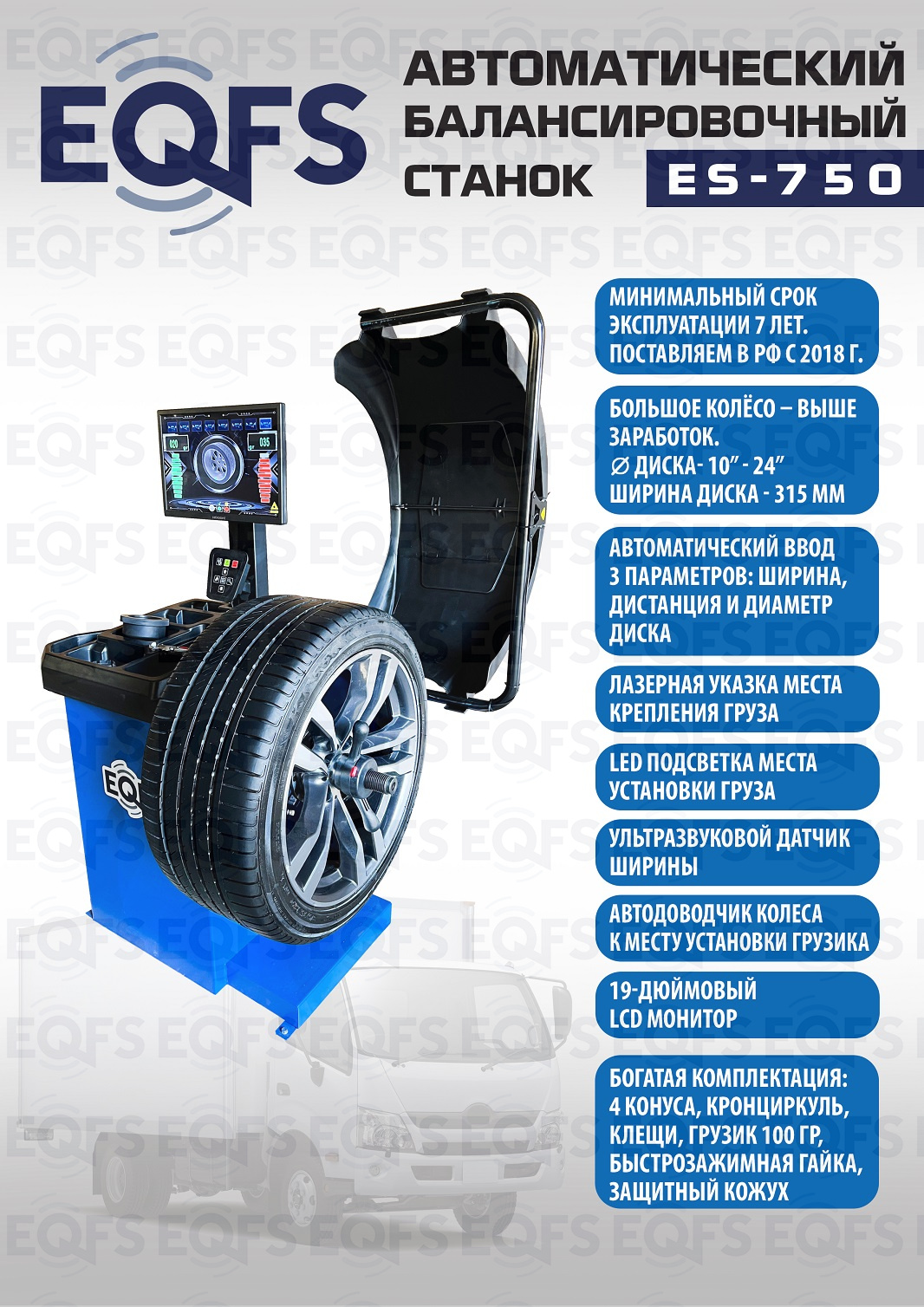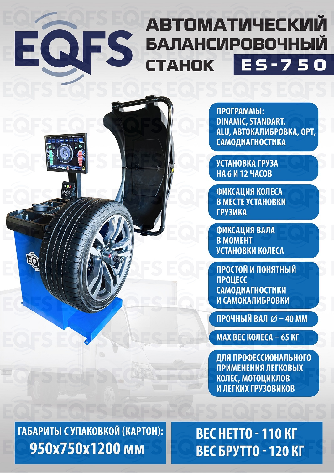 ES-750 Автоматический балансировочный станок. Ввод 3-х параметров ( диаметра диска, дистанции и ширины диска), 19-дюймовый LCD монитор с высококачественной 3D-графикой, ультразвуковой датчик ширины. Статическая и динамическая балансировка, ALU-программы для алюминиевых дисков. Программа OPT. Программа разделения и скрытой установки грузиков за спицами SPLIT. Режимы калибровки и самодиагностики. Для балансировки колёс легковых автомобилей, мотоциклов и лёгких грузовиков с диаметром колеса до 800 мм. Размеры диска: ширина 3–10” (76-254 мм) , диаметр диска 10–24” (254÷609 мм). Прочный вал Ø - 40мм. Вес колеса 65 кг. Гарантия 18 мес – наш монтаж, 12 мес – самостоятельная установка.