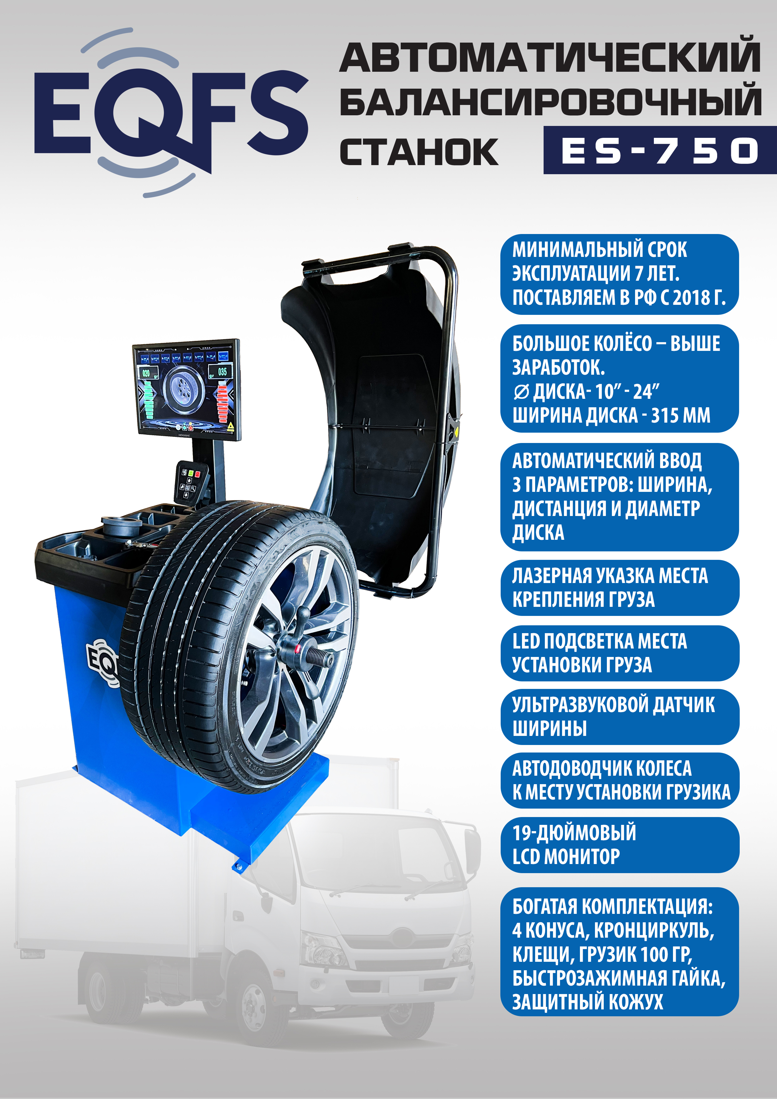 ES-750 Балансировочный станок. Автомат. Для широких колес 315 х R21 от BMW, MB, RANGE ROVER и т.д. Ввод 3-х параметров ( диаметра диска, дистанции и ширины диска), 19-дюймовый LCD монитор с высококачественной 3D-графикой, ультразвуковой датчик ширины. Автодоводчик и лазерная указка места установки грузика. Статическая и динамическая балансировка, ALU-программы для алюминиевых дисков. Программа OPT. Программа разделения и скрытой установки грузиков за спицами SPLIT. Режимы калибровки и самодиагностики. Для балансировки колёс с диаметром колеса до 800 мм. Размеры диска: ширина 3–10” (76-254 мм) , диаметр диска 10–24” (254÷609 мм). Прочный вал Ø - 40мм. Вес колеса 65 кг.