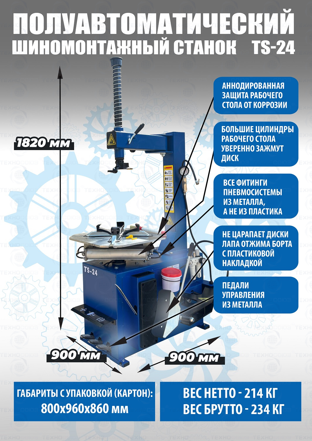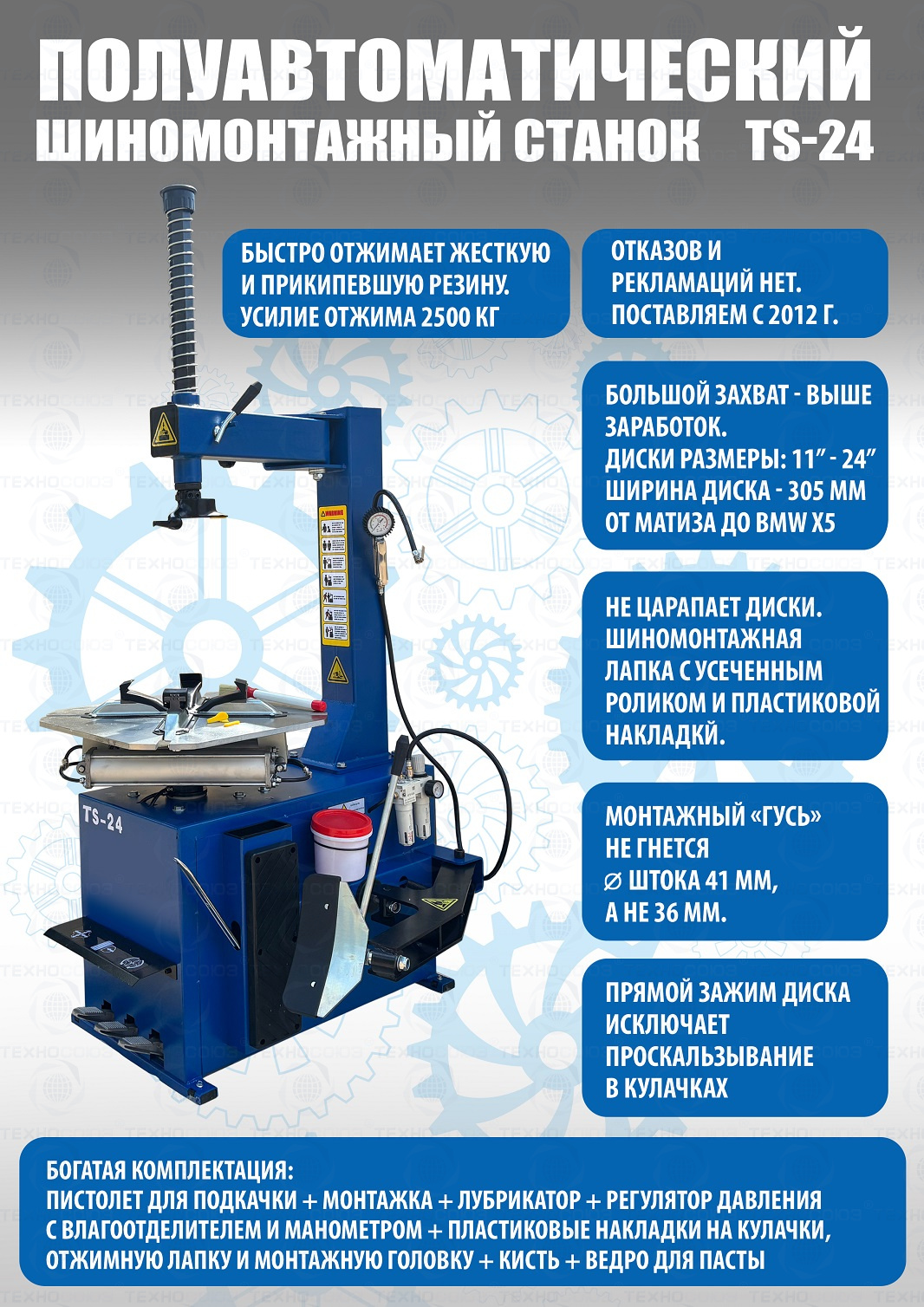 шиномонтажного станка TS-24. Полуавтоматический. Квадратный стол. Для дисков:11÷24”. Усилие отрыва покрышки 2700 кг. В комплекте: пистолет с манометром для подкачки шин + монтажка + пластиковые накладки на зажимные кулачки + регулятор давления с влагоотделителем и манометром