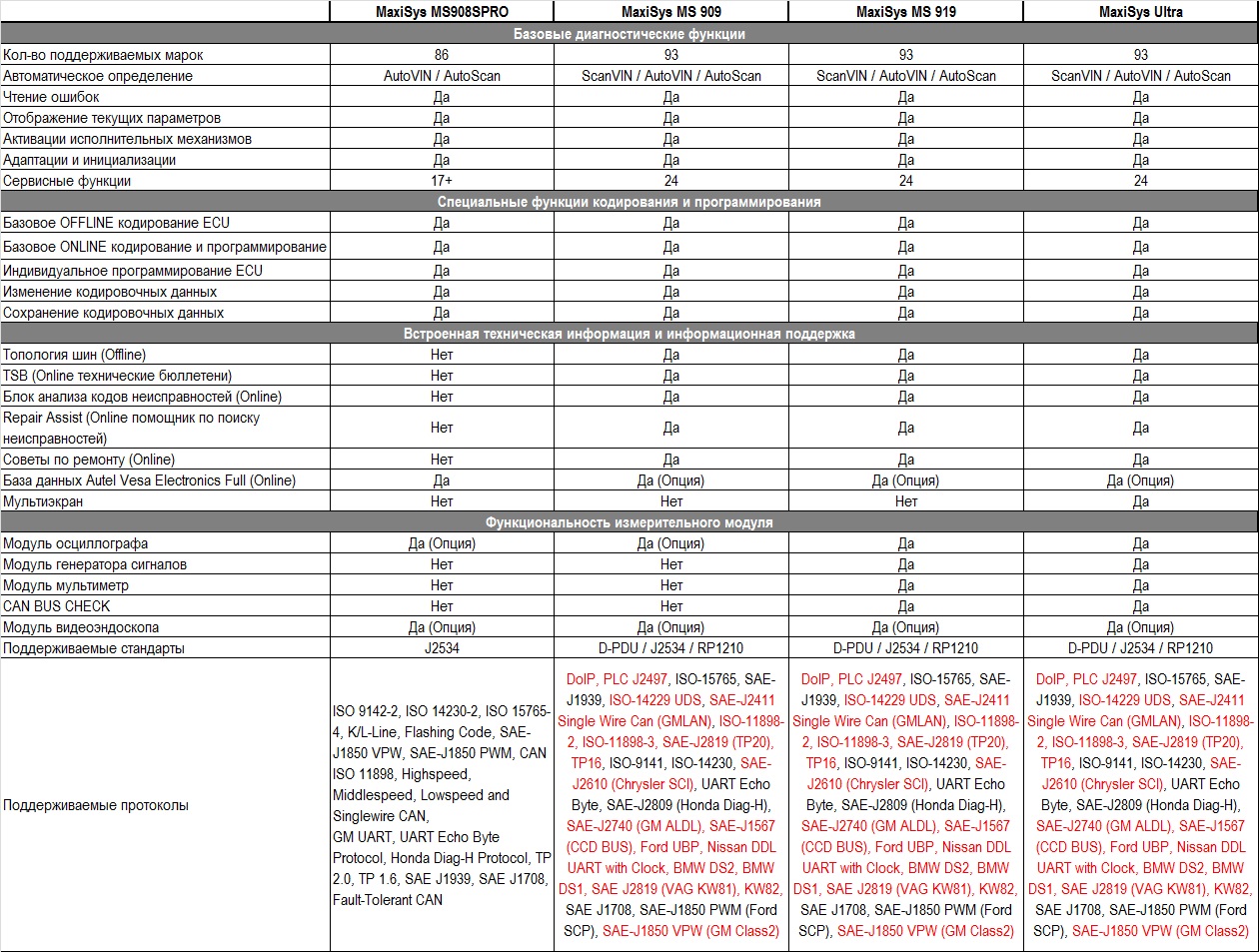 Протоколы DoIP, PLC J2497, ISO-15765, SAE-J1939, ISO-14229 UDS, SAE-J2411 Single Wire Can (GMLAN), ISO-11898-2, ISO-11898-3, SAE-J2819 (TP20), TP16, ISO-9141, ISO-14230, SAE-J2610 (Chrysler SCI), UART Echo Byte, SAE-J2809 (Honda Diag-H), SAE-J2740 (GM ALDL), SAE-J1567 (CCD BUS), Ford UBP, Nissan DDL UART with Clock, BMW DS2, BMW DS1, SAE J2819 (VAG KW81), KW82, SAE J1708, SAE-J1850 PWM (Ford SCP), SAE-J1850 VPW (GM Class2)