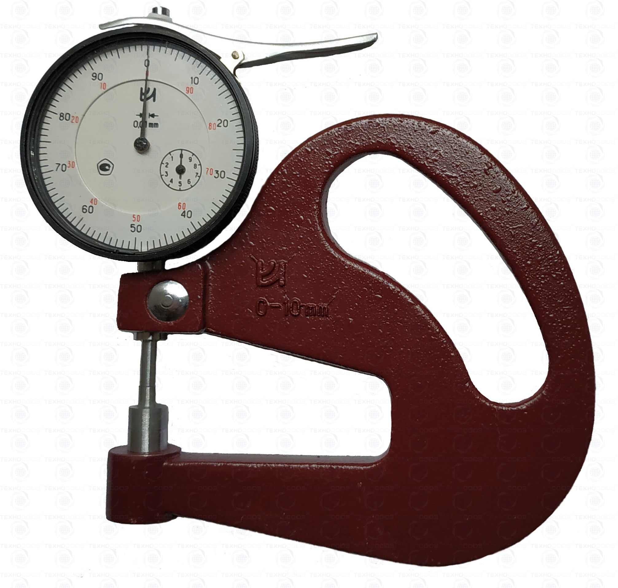 Толщиномер представляет собой скобу, в которой сверху расположено отсчетное устройство с измерительным наконечником , а снизу запрессована пятка. У толщиномера с нормированным измерительным усилием для установки измерительного стержня отсчетного устройства в рабочее положение имеется арретир (отводка).