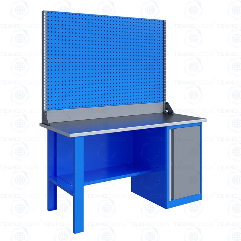 Однотумбовый. Допустимая нагрузка на столешницу 750 кг. Опорные элементы выполнены сварными из холоднокатаной стали. Для выполнения сборочных, ремонтных, слесарных, монтажных и других видов работ на производстве, в сервисных центрах, мастерских, гаражах, а также для обучения технологии в учебных заведениях. Комплектуется полкой-стенкой, расположенной под столешницей для удобного размещения габаритного инструмента и оснастки. Размеры верстака: 855x1596x696 мм. Вес: 65 кг. Поставляется в 4 комплектациях на выбор.